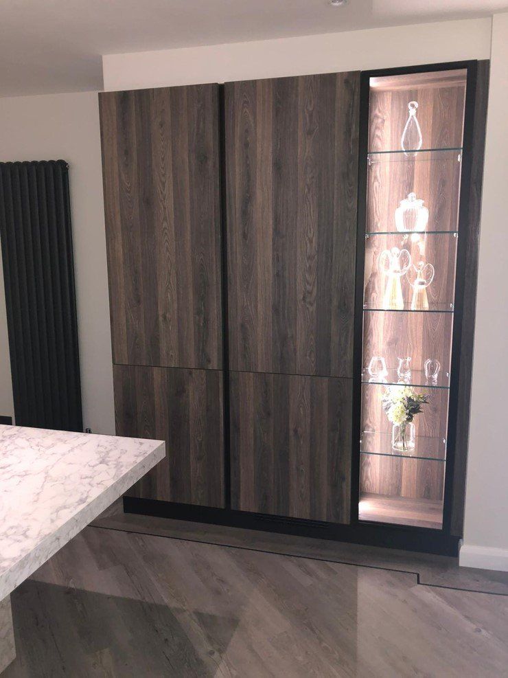 Notturno Doors, with Velvet Moca Glass fronted unit & interior LED lighting and cristal shelves